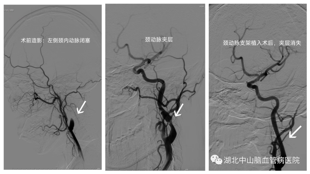 10分钟后,神经介入小组、麻醉小组就位,湖北中山脑血管病医院执行副院长万跃携神经介入医疗组朱碧峰组长和姜海伟组长为黄女士实施介入检查和治疗。造影结果提示,黄女士左侧颈内动脉起始部闭塞,又曾有颈动脉按摩病史,综合影像学表现和症状考虑是因动脉夹层导致此次卒中事件,遂为患者行颈动脉支架治疗。支架释放后患者左侧颈内动脉血流恢复通畅,颈动脉夹层消失。经过湖北中山脑血管病医院各个小组紧密配合,2小时后手术顺利结束,也成功挽救了一个家庭的幸福。