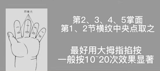 一是按四缝穴健胃化滞。立冬后正是进食肉类、贴冬膘的好时机。稍有不慎就会饮食积滞,损伤脾胃,增加体重。四缝穴是消宿食、化积滞的专属穴。取穴位置在第2.3.4.5掌面第1.2节横纹中央点。最好用大拇指掐按,一般按10~20次效果显着。