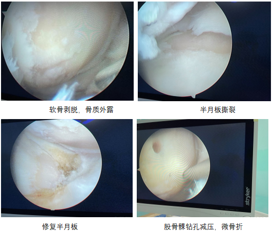 手术当天,王显勋通过关节镜查看到患者右膝关节软骨有大面积的剥脱,软骨下骨质外露,表现为明显的骨关节炎。同时内侧半月板后角可见明显撕裂。王显勋为李先生进行了半月板成形术,修复撕裂的半月板;同时行滑膜切除术以及股骨髁微骨折术,清理其膝关节腔,让损伤的骨质压力得以释放。