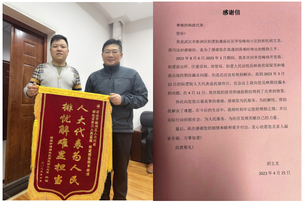 据了解,胡先生于2022年8月6日至2023年3月因房屋屋顶和墙面出现的裂纹漏水多次向房地产开发商、阳逻派出所、新洲区住房和城乡建设局、新洲区人民法院阳逻人民法院反映问题,但是迟迟没有得到解决。2023 年3月22日,在阳逻街人大代表选民接待日座谈会上,胡先生向杨波同志反映了房屋裂纹漏水的问题。4月11日,胡先生房屋屋顶和墙面的裂纹得到了完善的修复。胡先生特地赠送锦旗,诚挚感谢杨波同志帮助群众解决实际困难。