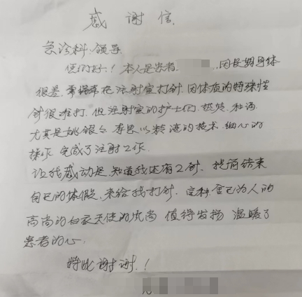 近日,张婆婆又因支气管扩张来到湖北省第三人民医院急诊科输液治疗。本想着“一针见血”是绝对不可能的事,谁知道该科姚银银和陈思两位护士认真评估、细心服务,更是凭借扎实的穿刺技术让婆婆仅一针就成功输上液,这让提前做好扎多次针准备的张婆婆非常意外也非常惊喜,高兴的她还手写感谢信来感谢姚银银和陈思两位护士。姚银银、陈思也考虑到婆婆的特殊情况,每次只要是婆婆来输液,都亲自上手操作,结果也都让婆婆很是满意。